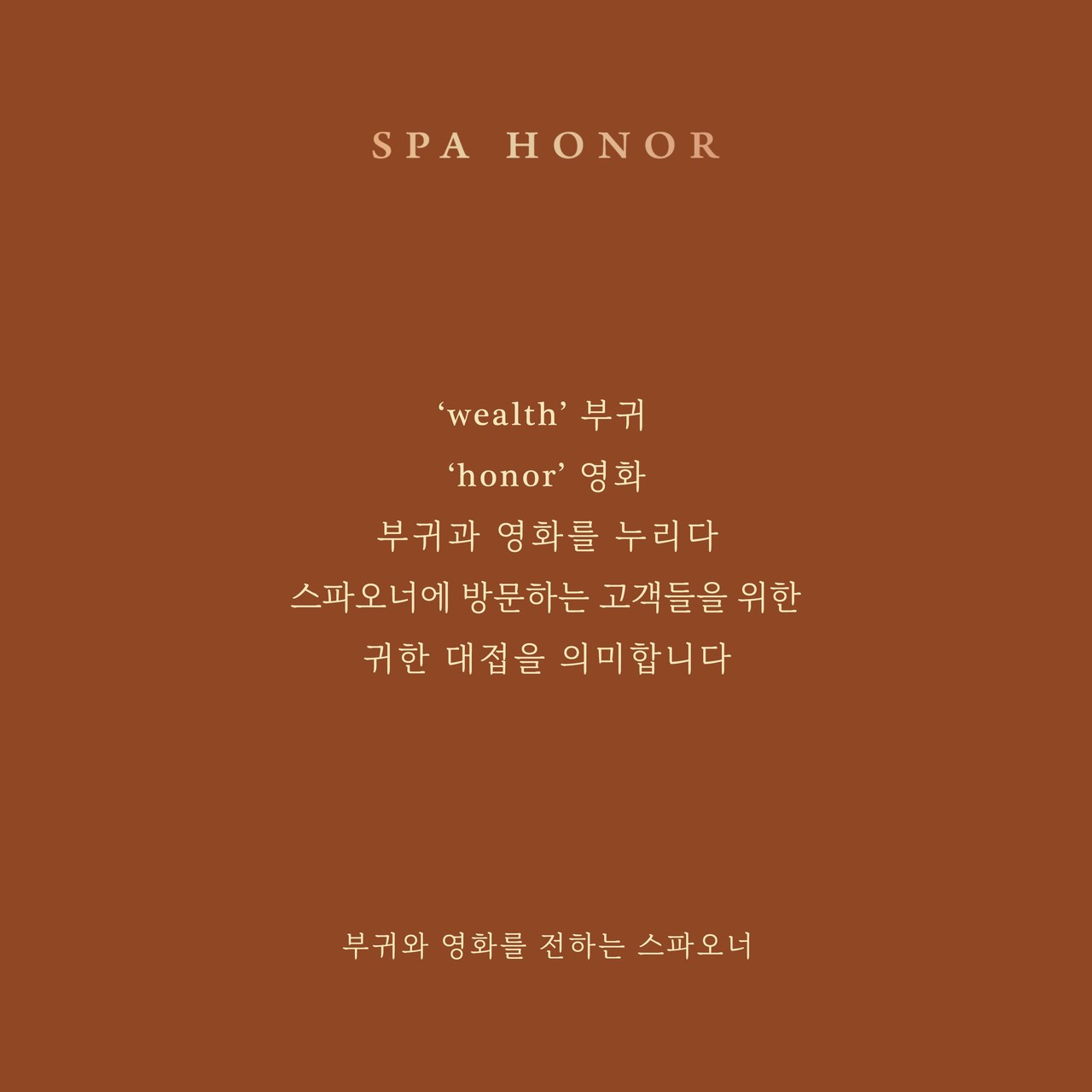 스파오너는 2대에 걸쳐 운영되는 패밀리스파로고객들에게 '부귀'와 '영화'가 되는 스파를 표현하기위해골드, 네이비, 블랙, 아이보리를 사용하여고급스러우면서도 편안하고 친숙한 모습으로고객분들의 일상에 가까이 머물며신뢰감 있는 서비스를 제공드릴 공간임을 표현하였습니다.